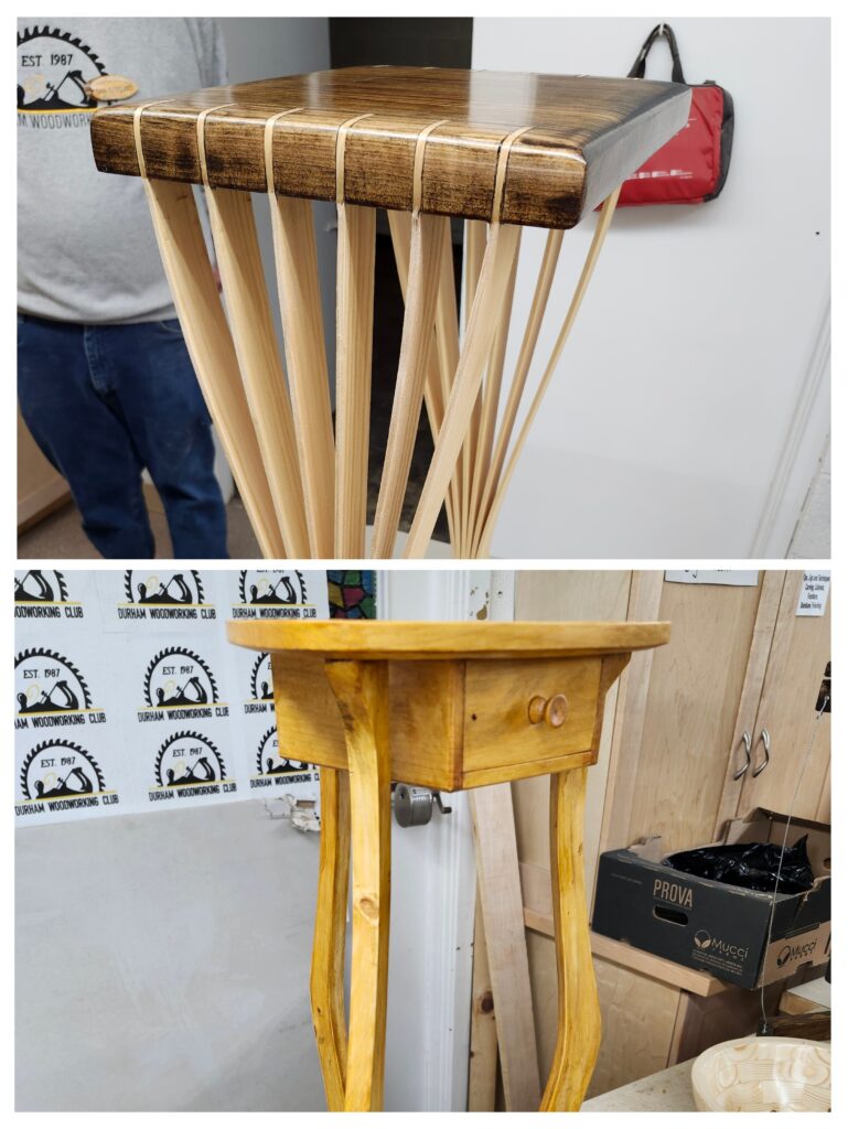 - Paul K. Presented a walnut and pine book shelf with some staining problem due to use of moist wooden drying racks…various solutions and ideas were discussed.